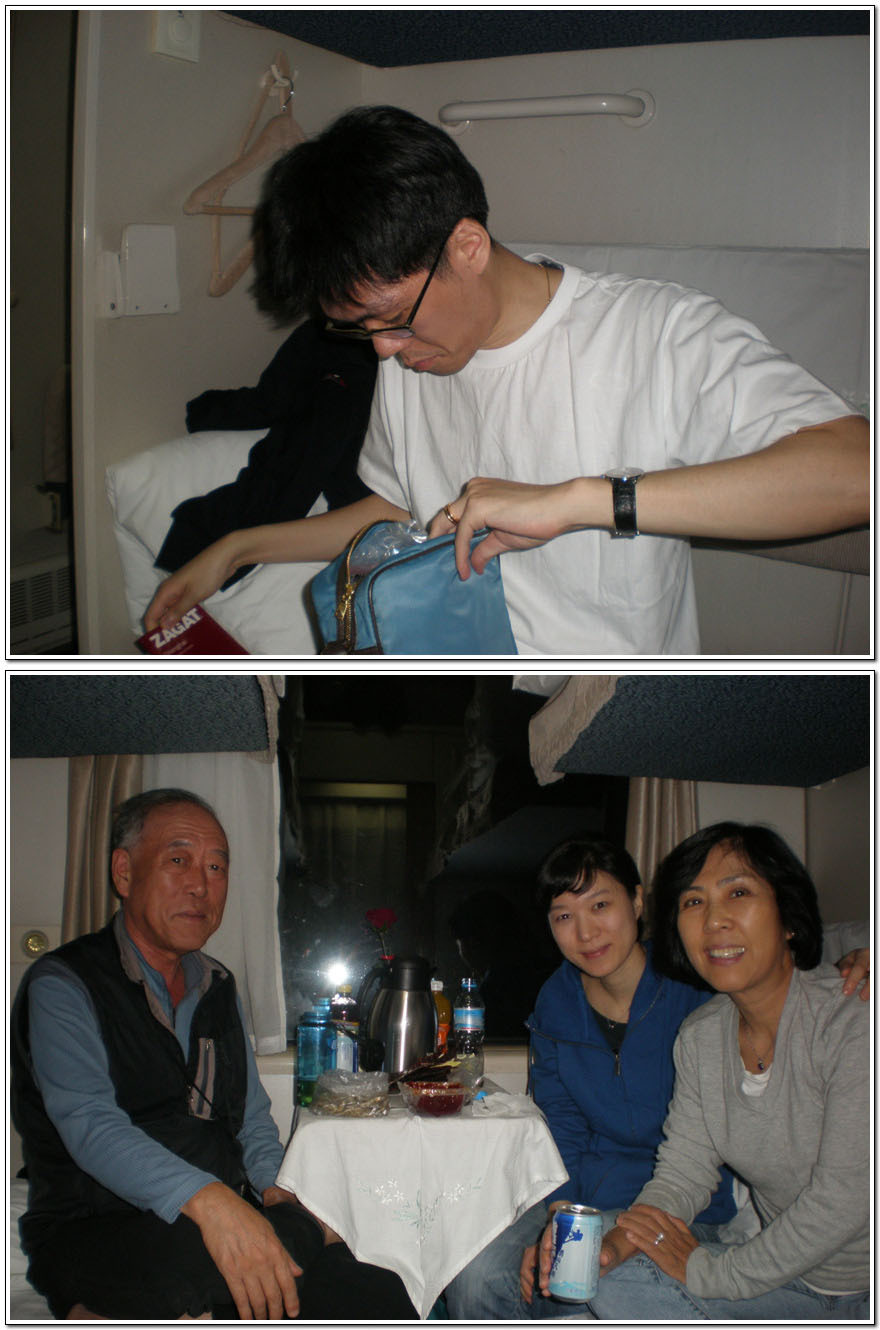 22시10분. 황산으로 가는 야간열차가 정시에 남경 역을 출발했다. 밤을 세워 7시간을 달려 가야하기 때문에 우리의 좌석은 당연히 침대칸(기차삯이 105,000원 정도)이다. 백두산을 가기위해 탔던 통화-이도백하간의 야간열차 3층 침대칸을 머리에 떠올리고 있었는데 그게 아니었다. 칸막이가 제대로 된 2층 4인실이다. 문만 닫으면 우리의 공간은 외부로부터 자유롭다. 하루를 마감하는 한 잔의 술. 그러나 중국 대륙의 어딘가를 달리는 열차는 덜컹거리는 소리만 일정하게 들려줄 뿐 잠을 쉽게 주지는 않는다.