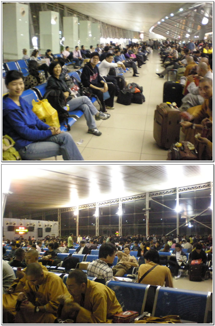남경역의 규모는 공항 못지않게 웅장하고 많은 사람들이 기차를 기다리고 있었다. 옷으로 평가할 일은 아니지만 대합실의 풍경은 좀 남루해 보였다. 개찰구 쪽으로는 사람들이 많이 몰려있기도 하고 신종 플루가 걱정되기도 해서 한쪽 구석에 자리 잡고 기차시간을 기다렸다. 바로 앞좌석의 승려 복 차림의 행자들이 음료수와 주먹만 한 알(타조 알?)로 식사를 대신하고 있었다. "중국 중들은 군중 앞에서도 육식을 하네."했더니 지은이는 "ㅋㅋㅋ..."이다. . * 남경역 대합실