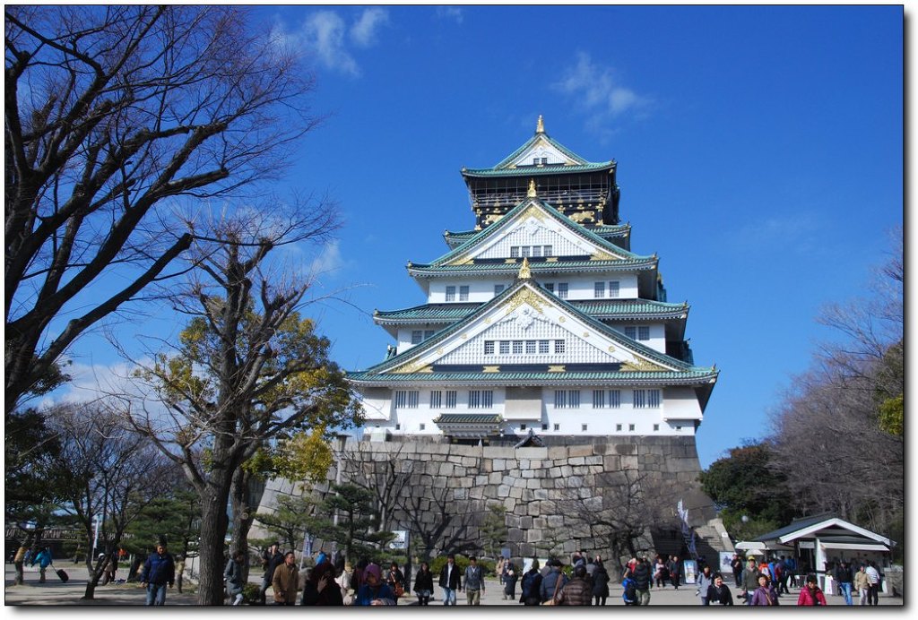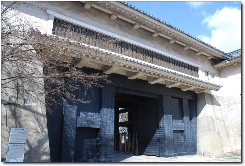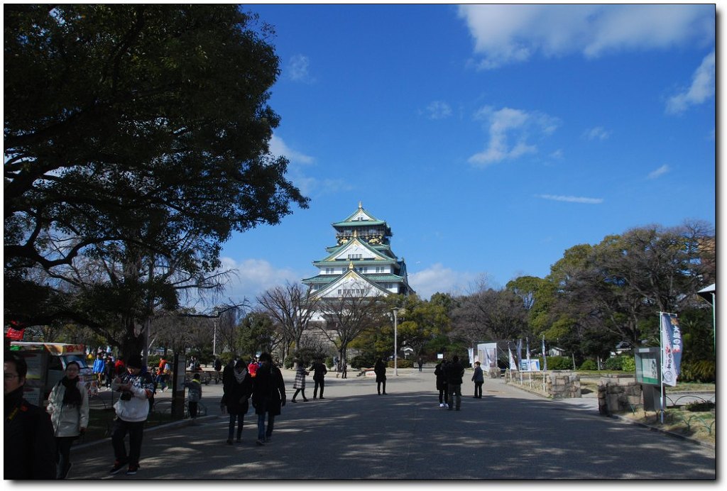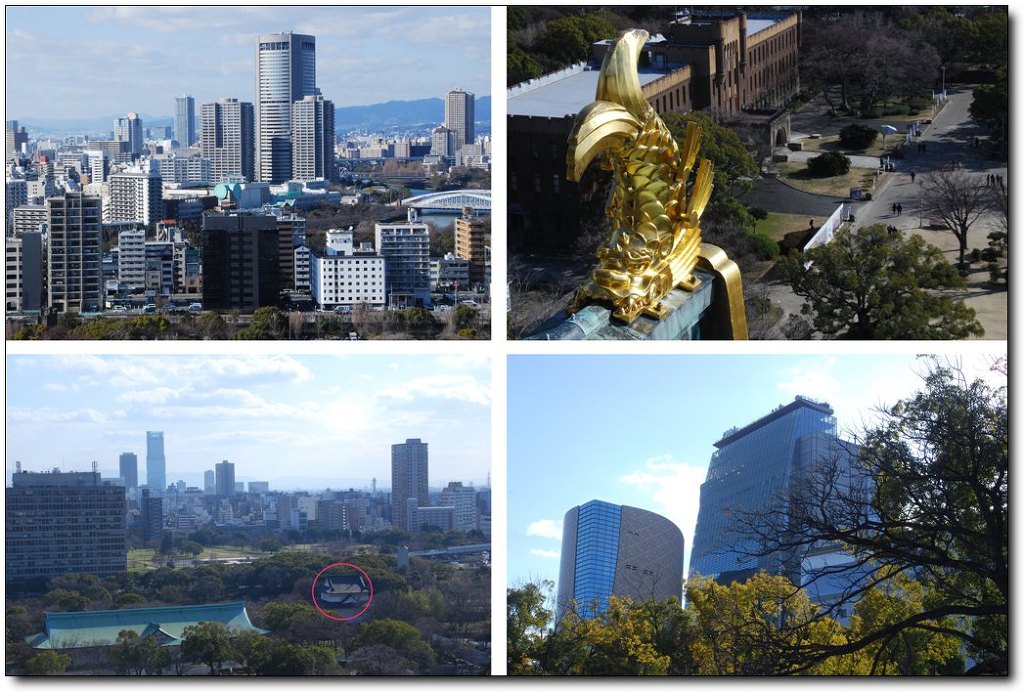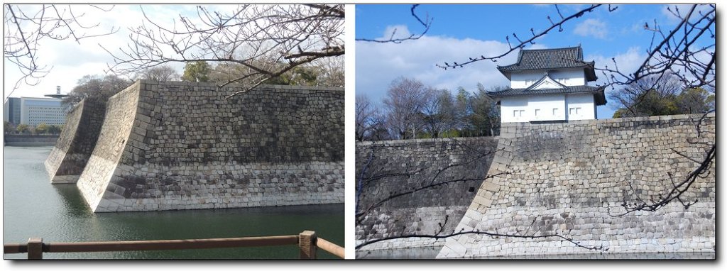 오사카성 진입은 오사카공원역(大阪公園駅) 쪽에서 출발해서 공원으로 들어선다. 왼쪽으로는 오사카의 높은 건물, 오른쪽으로는 망루, 성벽, 남쪽 바깥 해자(천수각 가까에는 안쪽 해자가 또 있다)를 보면서 공원을 돌아 정문에 들어선다. 곧 눈앞에 천수각이 떠 오른다.
