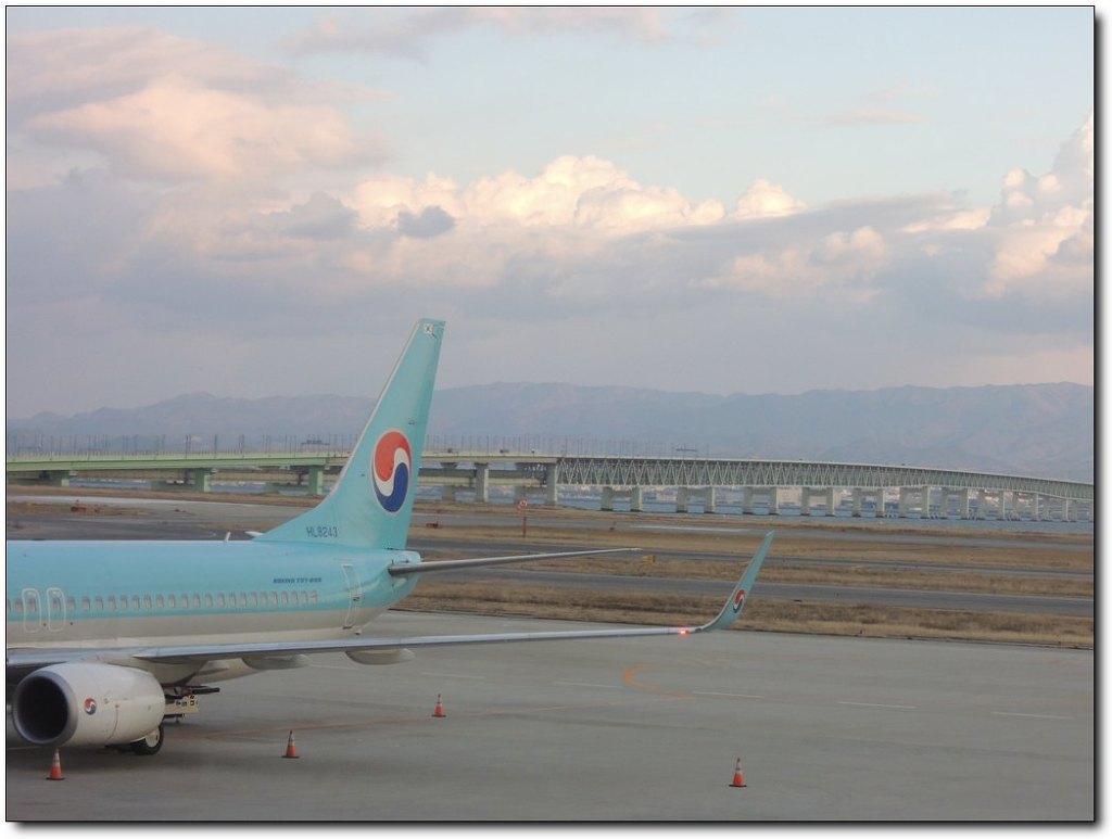 오사카 도심에서 40㎞ 떨어진 곳에 바다를 매립하여 인공 섬을 만든 다음 건설한 공항 간사이국제공항은 오사카국제공항의 과밀화와 소음문제를 해결하기 위해 1994년에 개항하였다. 우리는 특급 라피트(快速)를 타고 사진에 보이는 저 바다 위의 다리를 건너 오사카 중심부인 난바역으로 간다. 약 30분 정도 소요되었다.