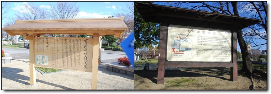 나니와(難波)란 ‘大阪시와 그 부근의 옛 이름’이라고 한다 7, 8세기의 오사카(大阪)의 나니와노미야(難波宮)는평지성이다. 특히 아스카·나라시대의 나니와노미야라는 이름의 난파궁은 오랫동안 그 위치를 모르고 있다가 1954년, 오사카의 우에마찌(上町) 북단 주택공사 현장에서 오사까 시립대학 야마네도꾸타로(山根德太郞) 교수에 의하여 발견되었다. 나라시대의 한 점의 기와가 계기가 되어 난파궁이 다시 탄생하였다고 한다. 다른 사람 집 밑을 파는 발견자 야마네도꾸타로 교수를 주위에서는 두더쥐(モグラ)라 했다는데 우리나라 일부에서는 풍납토성 발굴한 사연과 비슷하다고 주장한다. 그러나, 문화보호정책이나 보존운동은 일본과 차이가 있는 듯 하다. 일본에서는 궁궐지 내부 전체가 사적지로 지정되더라도 주민들이 당장 이주하거나 아파트를 철거하는 것이 아니라 사적지 안에 있는 기존의 아파트가 더 이상 사용이 불가능할 때 재개발하지 않고 시나 정부가 매입한 뒤에야 그 일대를 복원한다고 알려져 있다. 풍납토성 정화 봉사활동을 다니면서 대책 없이 발굴만 하겠다는 당국을 향한 주민들의 거센 항의 데모를 보던 기억이 새롭다. 난파궁지 건너편에 있는 오사카역사박물관 10층 전시실에는 난파궁지에서 발굴한 유물과 아울러 우리나라 백제의 모습을 볼 수 있고 전망대에 오르면 난파궁지 일대를 조망할 수 있다는데, 어인 일인지 입장 불가로 아쉽게 돌아섰다.