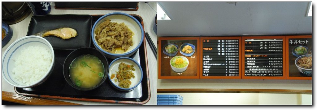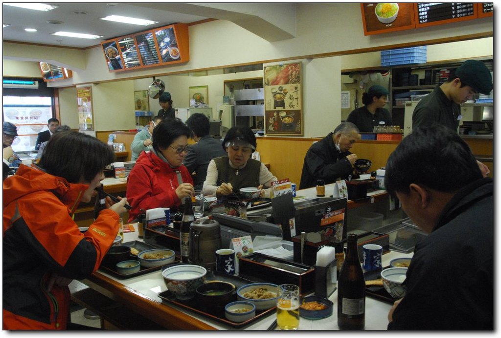 어쨌든 호텔에 짐을 맡기고 호텔 앞에서 식사, 말하자면 일본에 와서 처음으로 일본음식을 먹게된다. 5사람은 규동세트(牛丼セット 소고기덮밥)를, 2사람은 우동을 먹는다고 우동집으로 갔다.