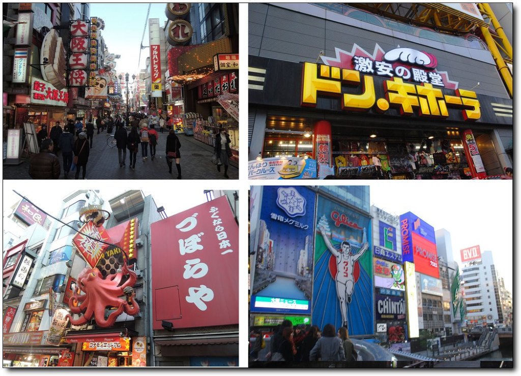 도톤보리[道頓堀]는 도톤보리강에 걸쳐 있는 에비스바시(えびす橋)에서 동쪽의 닛폰바시(日本橋)에 이르는 서민적인 분위기를 느낄 수 있는 신사이바시와 이웃하는 번화가이다. 난바로 이어지는 에비스바시에서 동쪽의 닛폰바시에 이르는 지역에는 화려한 네온사인과 독특한 간판이 많다. 특히 돈키호테는 유명한 파격세일의 전당으로 젊은이들이 바구니에 가뜩 물건을 구입하는 모습을 24시간 볼 수 있다.
