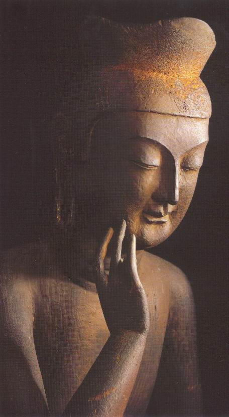 왼쪽 다리는 내리고 오른쪽 다리를 왼쪽 다리에 얹은 반가부좌 자세로 약간 숙인 얼굴을 오른손을