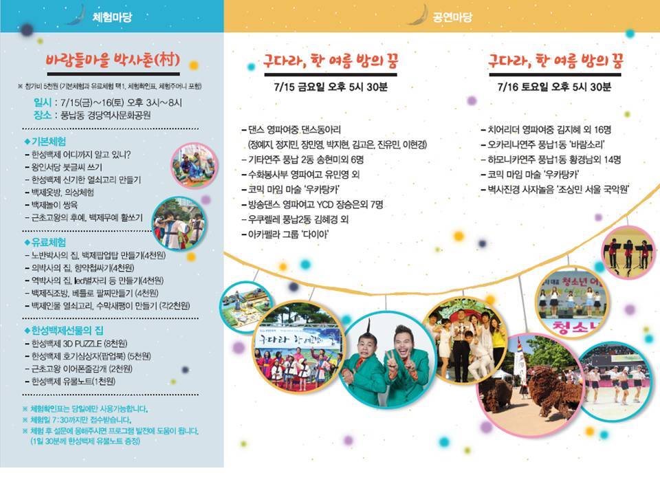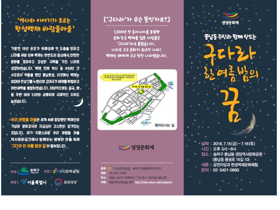 구다라 한여름 밤의 꿈 행사 안내 7/15(금)~7/16(토) 작성자차숙영|작성시간16.07.07|조회수79 목록 댓글 0 글자크기 작게가 글자크기 크게가 문의 : 02) 3401-0660 (사) 문화살림 다음검색 현재 게시글 추가 기능 열기 북마크 공유하기 신고 센터로 신고 댓글 댓글 0 댓글쓰기 답글쓰기 댓글 리스트