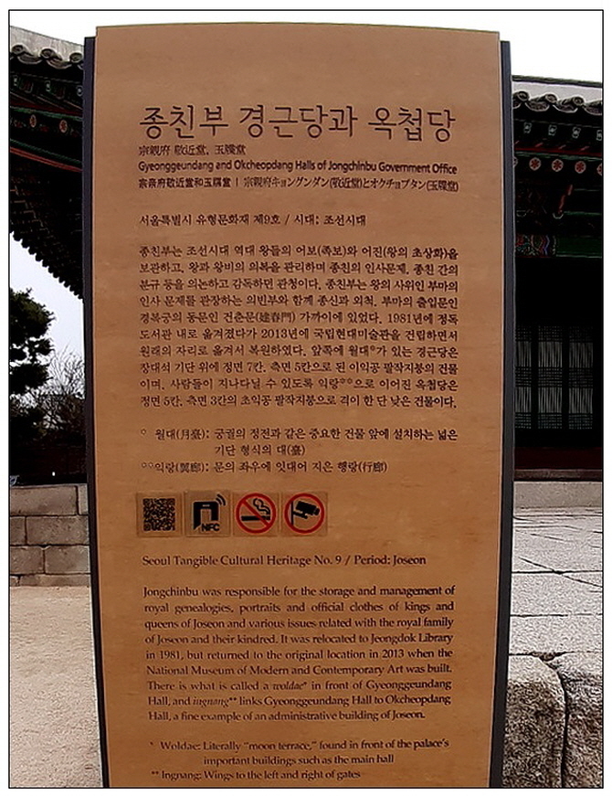 지인께서 종친부의 위치를 자세히 설명을 해주시는 것을 듣다 보니 제가 ‘국립현대미술관 서울관’에 갔을 때 뒤편에 궁궐의 한 부분처럼 보이는 건물이 있어 사진 몇 매 촬영하였던 곳을 알려주셨습니다. 위치를 인지하고는 4월 10일 집을 나서 안국역에서 바로 종친부를 향해 가는중에 비가 오기시작 하여 우산을사고 종친부에 도착 했을때는 가랑비처럼 조금씩 내려 경근당과 옥첩당 주변 모습을 촬영하였고 안네판도 꼼꼼히 읽어 보았습니다.