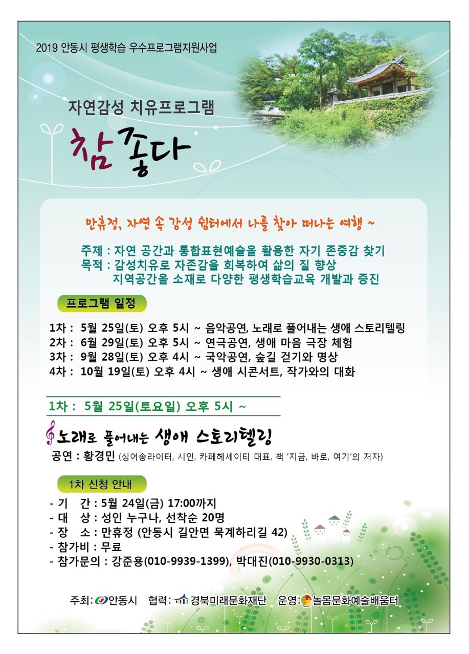 자연감성치유프로그램 '참좋다' … 1차 참여자 모집 작성자태권V|작성시간19.05.16|조회수138 목록 댓글 0 글자크기 작게가 글자크기 크게가 자연감성치유프로그램 '참좋다'1차 참여자 모집 다음검색 현재 게시글 추가 기능 열기 북마크 공유하기 신고 센터로 신고 댓글 댓글 0 댓글쓰기 답글쓰기 댓글 리스트