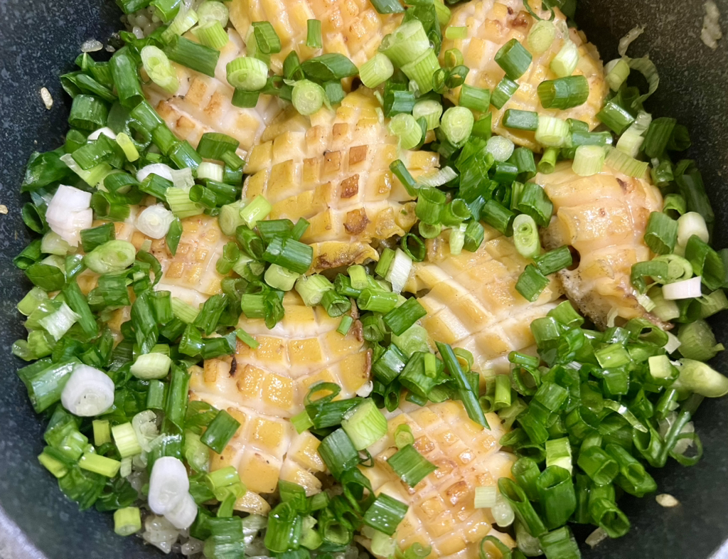 참기름 1T 넣고 내장을 볶는다 - 쌀을 넣어서 함께 볶는다 -물 넣고 솥밥 한다