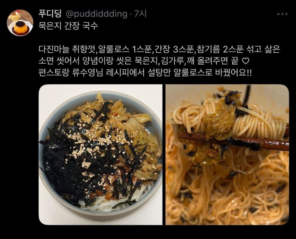 CAFE 집에있는 묵은지로 간장 국수 레시피 (ft.류수영) cafe 별장 작성시간25.07.13 앱으로보기 < 묵은지 간장 국수 >다진마늘 취향껏, 알룰로스 1스푼,간장 3스푼, 참기름 2스푼 섞고삶은 소면과 양념이랑씻은 묵은지,김가루, 깨 올려주면 끝 카페방문 댓글 1 현재 게시글 추가 기능 열기 공유하기 신고 센터로 신고