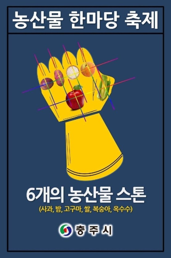 어벤저스 타노스 장갑 스톤에 농산물 사진 넣을 생각을 하려면 하루종일 충주시 농작물 홍보로 머릿속이 가득 차야되는거 아니여요? ㅋㅋ