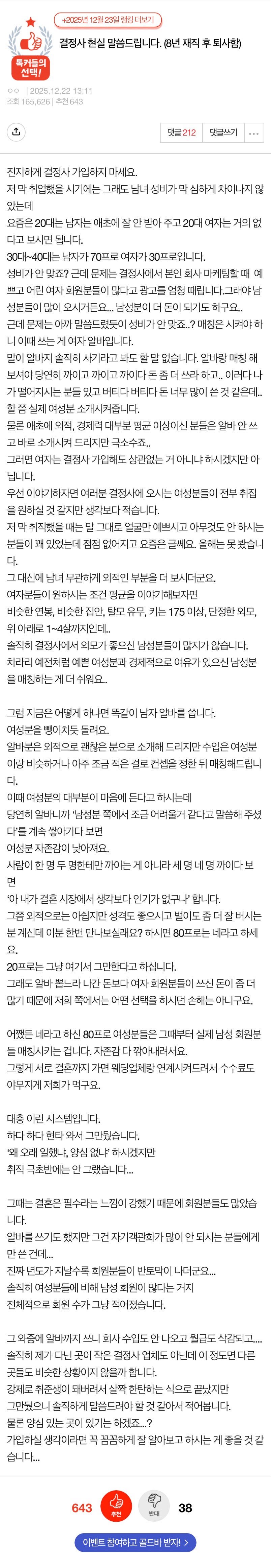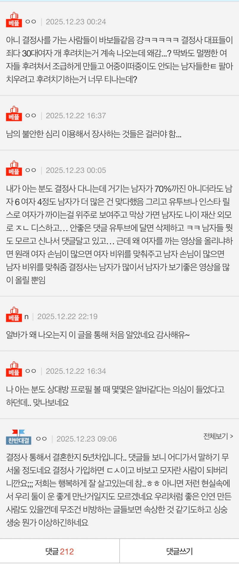 결정사 현실 말씀드립니다. (8년 재직 후 퇴사함) 작성자별|작성시간25.12.30|조회수464 목록 댓글 1 글자크기 작게가 글자크기 크게가 https://m.pann.nate.com/talk/375102467결정사 현실 말씀드립니다. (8년 재직 후 퇴사함) | 네이트 판회사생활 : 진지하게 결정사 가입하지 마세요. 저 막 취업했을 시기에는 그래도 남녀 성비가 막 심하게 차이나지 않았는데요즘은 20대는 남자는 애초에 잘 안 받아 주고 20대 여자는 거의 ...pann.nate.com 다음검색 현재 게시글 추가 기능 열기 북마크 공유하기 신고 센터로 신고 댓글 댓글 1 댓글쓰기 답글쓰기 댓글 리스트 작성자별 | 작성시간 25.12.31 저기 범죄자도있음전여친 스토킹해서실형받은애 가입하더라 댓글 전체보기