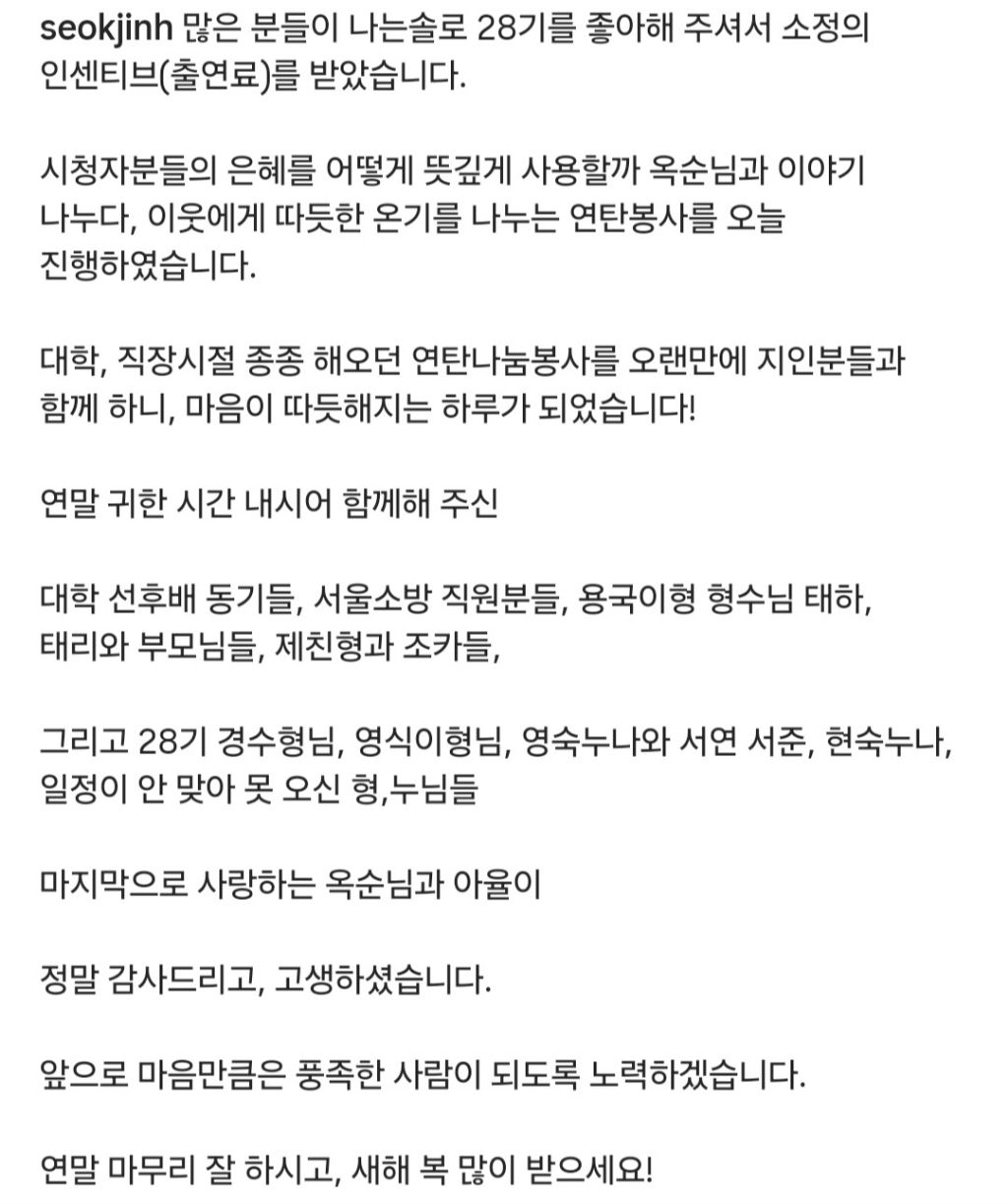 나솔 인센티브 받고 연탄 봉사 다녀왔다는 28기 멤버들 작성자별|작성시간25.12.31|조회수400 목록 댓글 1 글자크기 작게가 글자크기 크게가 ㅊㅊ 28기 영호 인스타 / ㄷㅋ 다음검색 현재 게시글 추가 기능 열기 북마크 공유하기 신고 센터로 신고 댓글 댓글 1 댓글쓰기 답글쓰기 댓글 리스트 작성자별 | 작성시간 25.12.31 👍 👍 👍 댓글 전체보기