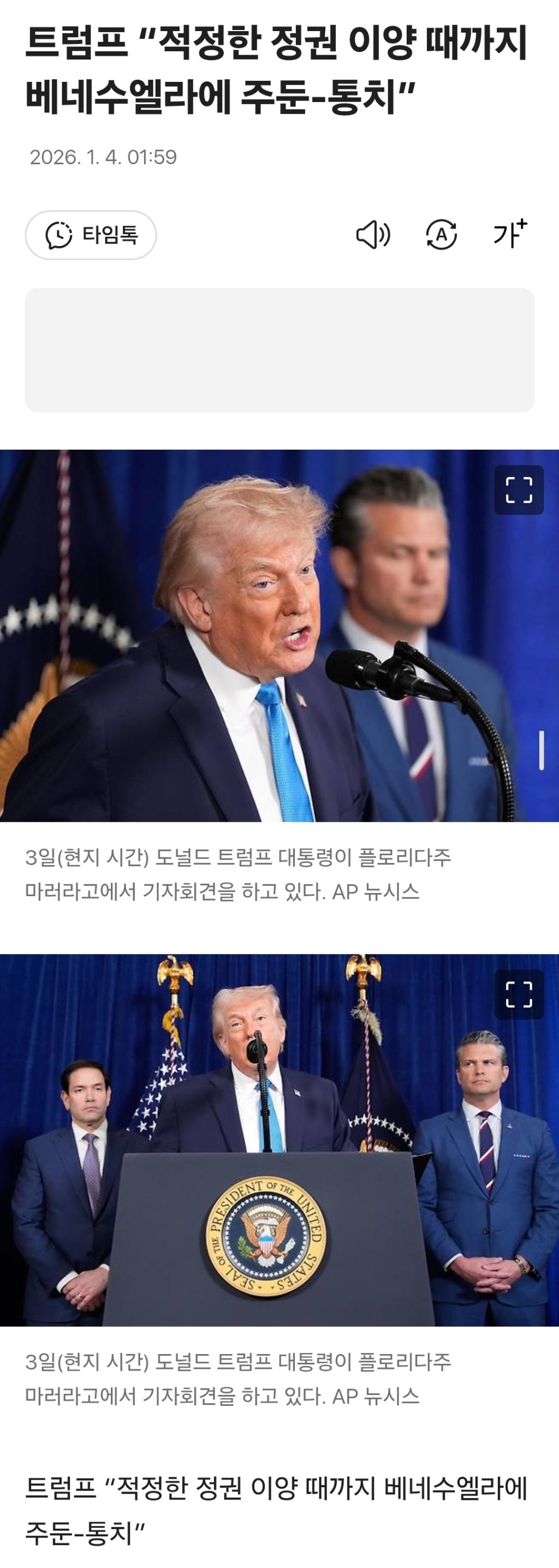 트럼프 “적정한 정권 이양 때까지 베네수엘라에 주둔-통치” 작성자별|작성시간26.01.04|조회수226 목록 댓글 4 글자크기 작게가 글자크기 크게가 https://v.daum.net/v/20260104015940964트럼프 “적정한 정권 이양 때까지 베네수엘라에 주둔-통치”3일(현지 시간) 도널드 트럼프 대통령이 플로리다주 마러라고에서 기자회견을 하고 있다. AP 뉴시스3일(현지 시간) 도널드 트럼프 대통령이 플로리다주 마러라고에서 기자회견을 하고 있다. AP 뉴v.daum.net 다음검색 현재 게시글 추가 기능 열기 북마크 공유하기 신고 센터로 신고 댓글 댓글 4 댓글쓰기 답글쓰기 댓글 리스트 작성자별 | 작성시간 26.01.04 식민지네요.. 와...정권이양이 제대로 되려나.. 작성자별 | 작성시간 26.01.04 석유랑 광물( 희토류)자원 때문일까요? 물론 마두로가 반미독재한건 맞는데 그런 나라가 베네수엘라만 그런것도 아니고요;; 작성자별 | 작성시간 26.01.04 무섭네요 ㅉㅉ 작성자별 | 작성시간 26.01.04 깡패새끼 댓글 전체보기