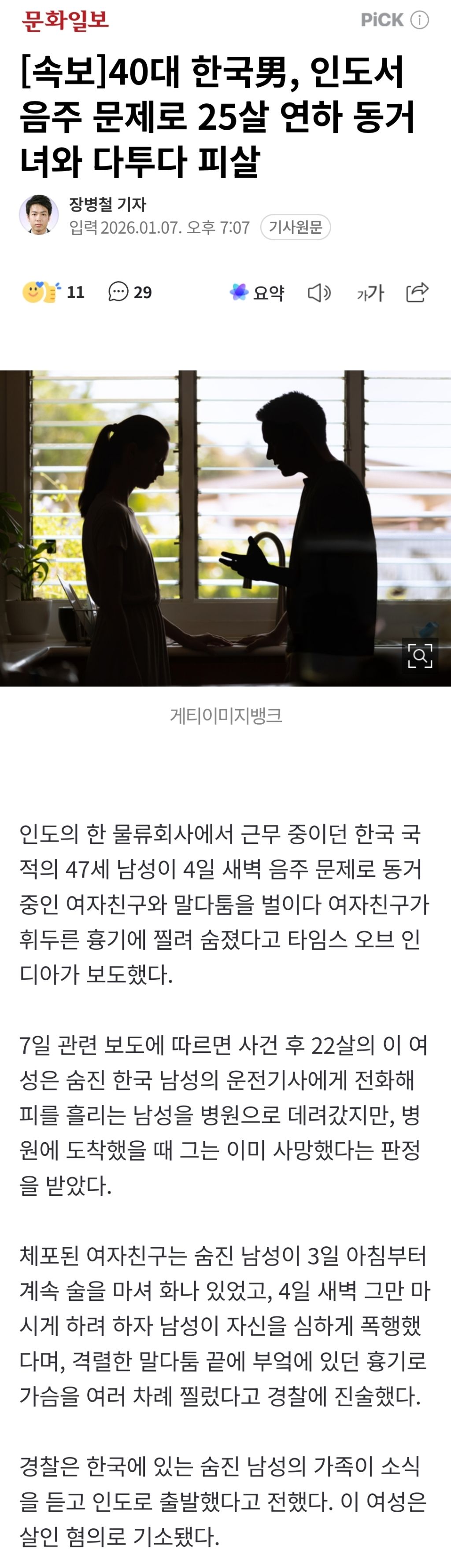 [속보]40대 한국男, 인도서 음주 문제로 25살 연하 동거녀와 다투다 피살 작성자별|작성시간26.01.07|조회수384 목록 댓글 4 글자크기 작게가 글자크기 크게가 https://naver.me/FkLg6aom[속보]40대 한국男, 인도서 음주 문제로 25살 연하 동거녀와 다투다 피살게티이미지뱅크 인도의 한 물류회사에서 근무 중이던 한국 국적의 47세 남성이 4일 새벽 음주 문제로 동거 중인 여자친구와 말다툼을 벌이다 여자친구가 휘두른 흉기에 찔려 숨졌다고 타임스 오n.news.naver.com 다음검색 현재 게시글 추가 기능 열기 북마크 공유하기 신고 센터로 신고 댓글 댓글 4 댓글쓰기 답글쓰기 댓글 리스트 작성자별 | 작성시간 26.01.07 원남이 또 ㅉㅉ 작성자별 | 작성시간 26.01.07 잘 뒤졌… 저나이에 저런 어린애랑 불륜하다 불륜녀한테 칼맞아 죽는 인생이라니… 저런것도 가족이라고 수습하러 가는 부인만 불쌍하긔.. 작성자별 | 작성시간 26.01.07 부인만 불쌍하네요... 작성자별 | 작성시간 26.01.09 추잡스럽네 ㅡㅡ 댓글 전체보기