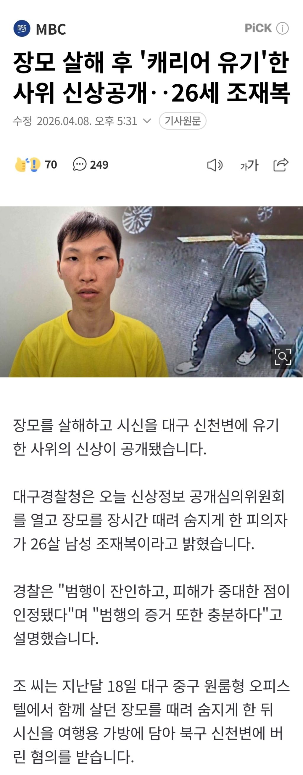 장모 살해 후 '캐리어 유기'한 사위 신상공개‥26세 조재복 작성자별|작성시간26.04.08|조회수316 목록 댓글 8 글자크기 작게가 글자크기 크게가 https://naver.me/5o0QkJQI장모 살해 후 '캐리어 유기'한 사위 신상공개‥26세 조재복장모를 살해하고 시신을 대구 신천변에 유기한 사위의 신상이 공개됐습니다. 대구경찰청은 오늘 신상정보 공개심의위원회를 열고 장모를 장시간 때려 숨지게 한 피의자가 26살 남성 조재복이라n.news.naver.com 다음검색 현재 게시글 추가 기능 열기 북마크 공유하기 신고 센터로 신고 댓글 댓글 8 댓글쓰기 답글쓰기 댓글 리스트 답댓글 작성자별 | 작성시간 26.04.08 어머..진짜 ㅈ깥이 생겻다 하면서 스크롤 내럈는데 ...하..저런놈을 왜 만나서 ㅠㅠ 답댓글 작성자별 | 작성시간 26.04.08 4444 작성자별 | 작성시간 26.04.08 26세라니 작성자별 | 작성시간 26.04.08 개쓰레기… 감옥가서 양아치들한테 똑같이 죽을때까지 쳐맞길… 작성자별 | 작성시간 26.04.09 new 인상진짜 댓글 전체보기