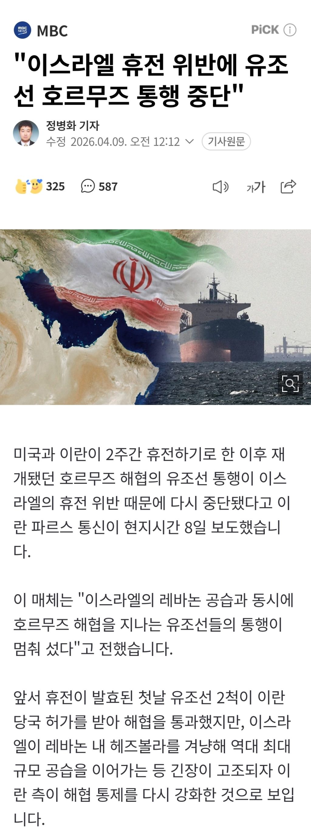 "이스라엘 휴전 위반에 유조선 호르무즈 통행 중단" 작성자별|작성시간26.04.09|조회수75 목록 댓글 1 글자크기 작게가 글자크기 크게가 https://naver.me/xUZSwGOr"이스라엘 휴전 위반에 유조선 호르무즈 통행 중단"미국과 이란이 2주간 휴전하기로 한 이후 재개됐던 호르무즈 해협의 유조선 통행이 이스라엘의 휴전 위반 때문에 다시 중단됐다고 이란 파르스 통신이 현지시간 8일 보도했습니다. 이 매체는 "n.news.naver.com 다음검색 현재 게시글 추가 기능 열기 북마크 공유하기 신고 센터로 신고 댓글 댓글 1 댓글쓰기 답글쓰기 댓글 리스트 작성자별 | 작성시간 26.04.09 new 아이고 쫌!!! 댓글 전체보기