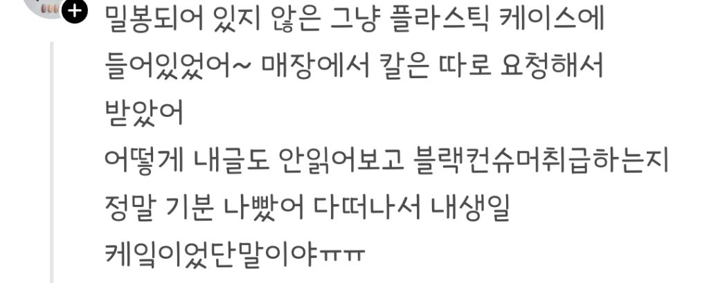 작성자별 작성시간 25.01.24 빵칼이 비닐 포장된 채 저렇게 들어가 있었다면 누군가 빵이 나온 후에 밀어넣은거 아닌가요?? 통에 스티커같은 밀봉도 뜯어져있고 빵칼도 받아 오셨다고 했는데 혹시 가족중에 아이나 누가 장난친건 아니겠죠? 아니면 매장에서 누가 장난친거 같은데요. 롤케익 매장에서 마는거 아니고 공장에서 말아서 나오는거죠? 어찌된 일인지 궁금하다긔. 회사는 조사를 왜 안하는거긔?