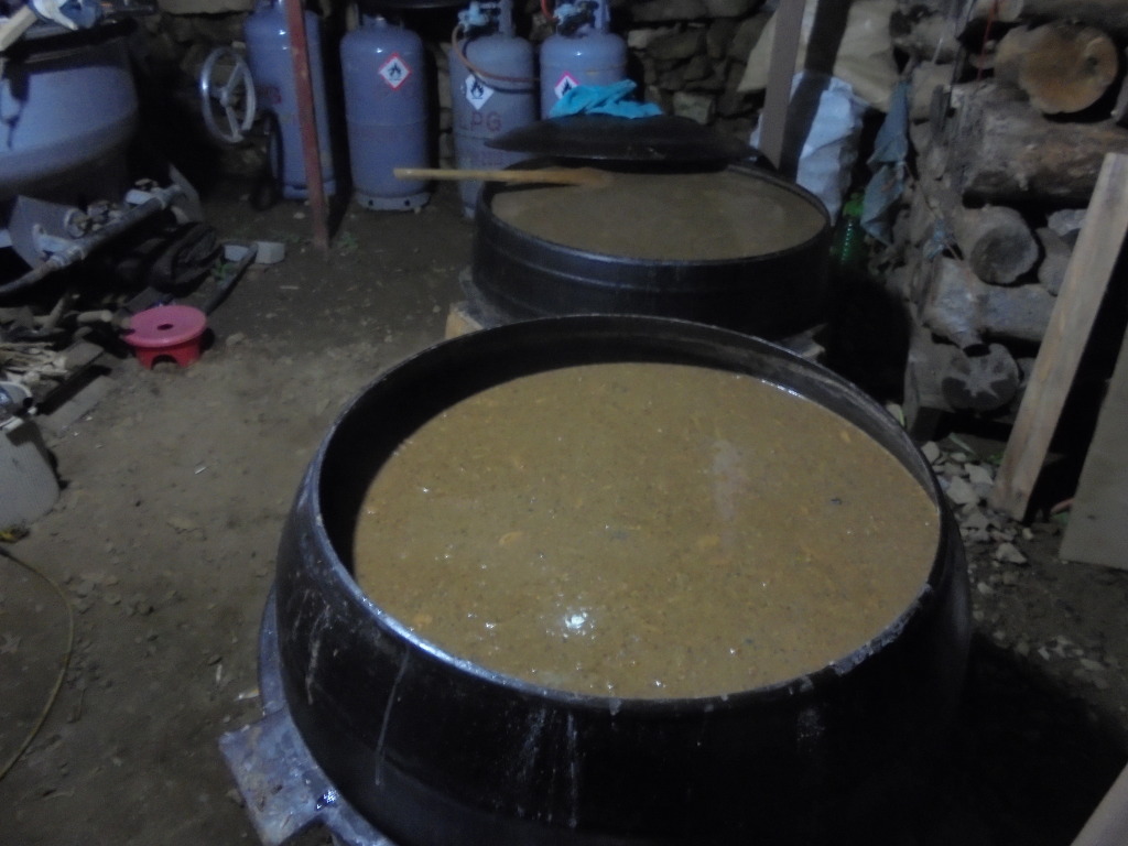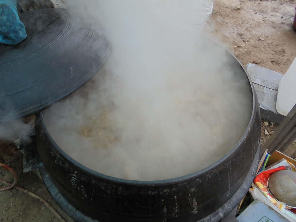 수수쌀과 엿기름을 넣고 가마솥 두곳에서 삭히는 과정입니다