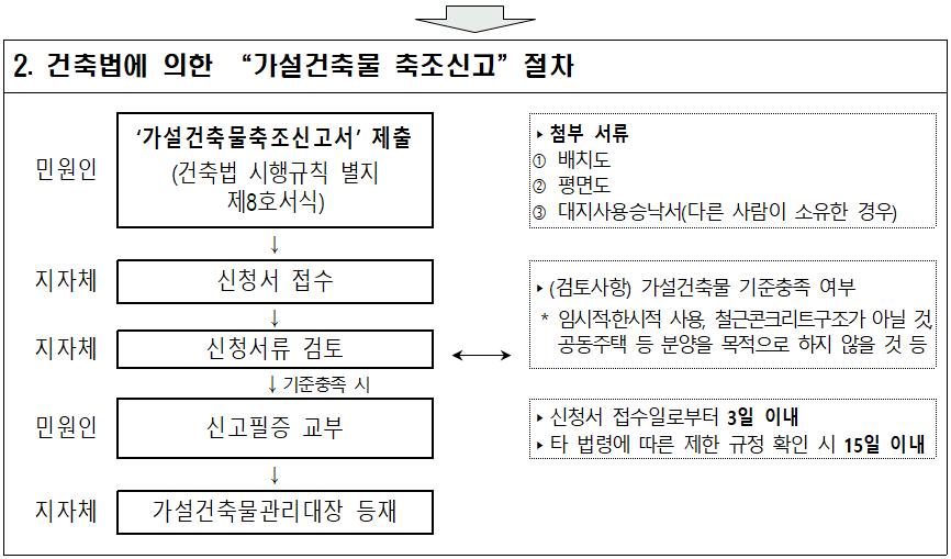 * 설치 신고 → 지자체 입지 확인 → 가설건축물 축조 신고 → 농지대장 등재