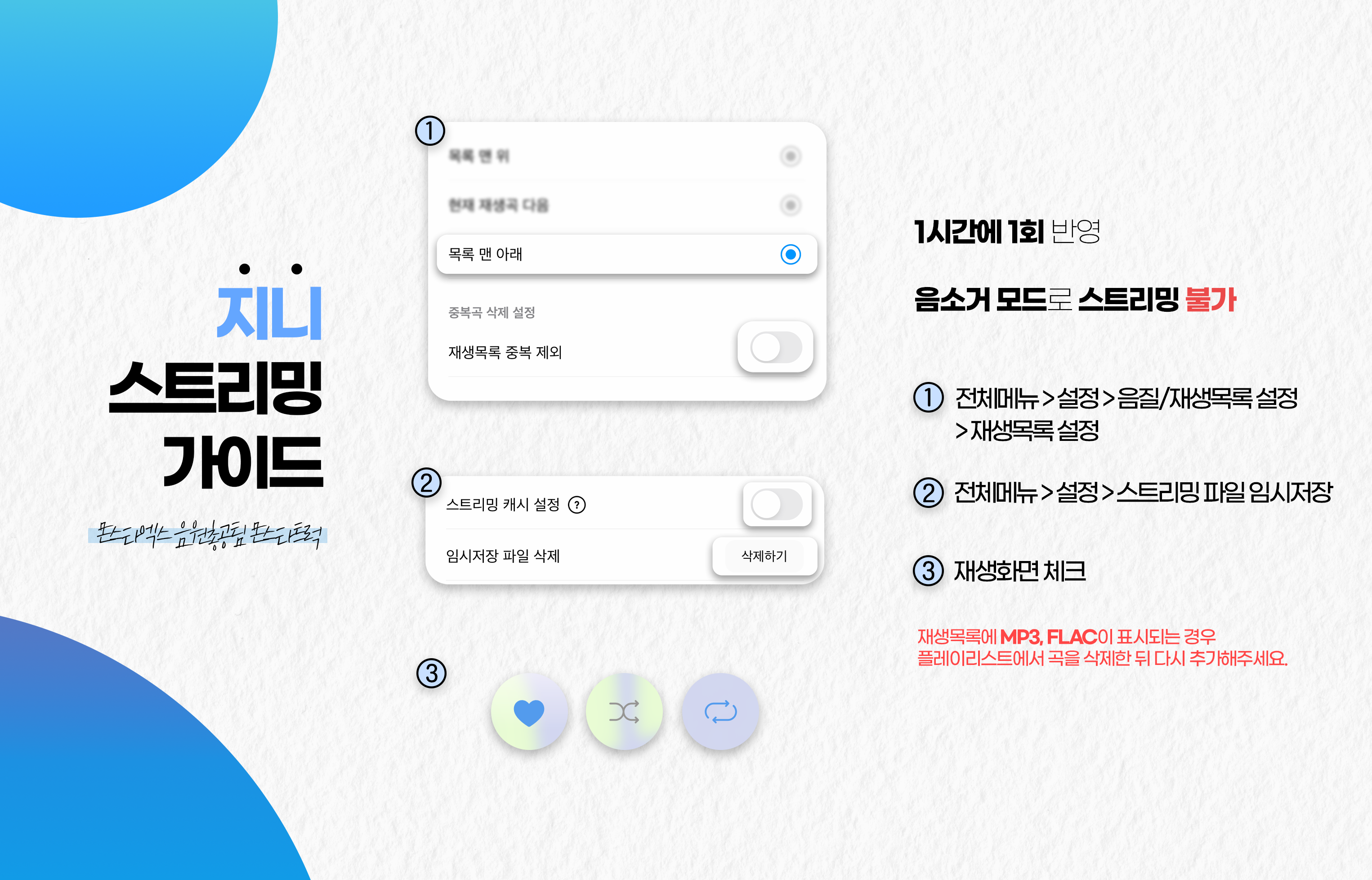 - 반복재생 / 한곡재생 / 셔플 금지