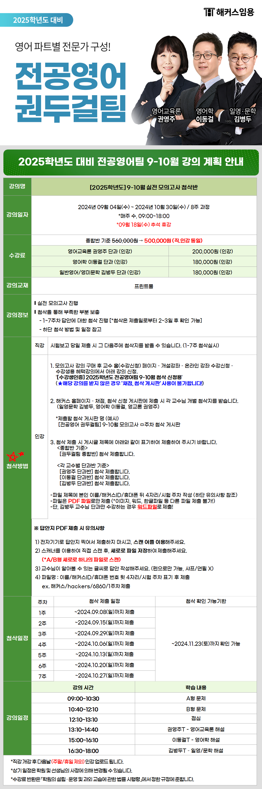 [전공영어 권.두.걸팀] 2025학년도 9-10월 실전 모의고사 강의 안내 (9.4 개강) 작성자해커스임용|작성시간24.08.07|조회수112 목록 댓글 0 글자크기 작게가 글자크기 크게가 ※접수 오픈일※직강 : 2024년 8월 8일(목) 15:00시부터 접수 가능인강 : 2024년 8월 7일(수) 16:00시부터 접수 가능 (*단, 학원 사정에 따라 접수일정 조정될 수 있습니다.) 다음검색 현재 게시글 추가 기능 열기 북마크 공유하기 신고 센터로 신고 댓글 댓글 0 댓글쓰기 답글쓰기 댓글 리스트