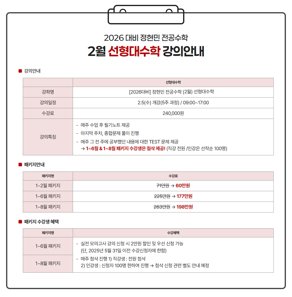 [정현민 전공수학] 2026 대비 2월 선형대수학 ⭐샘플강의⭐ 작성자G스쿨|작성시간25.02.06|조회수129 목록 댓글 0 글자크기 작게가 글자크기 크게가 ★정현민 전공수학 2월 선형대수학 강의 안내★2월 5일 수요일 개강! <2월 선형대수학 강의 1강 샘플강의> 다음검색 현재 게시글 추가 기능 열기 북마크 공유하기 신고 센터로 신고 댓글 댓글 0 댓글쓰기 답글쓰기 댓글 리스트