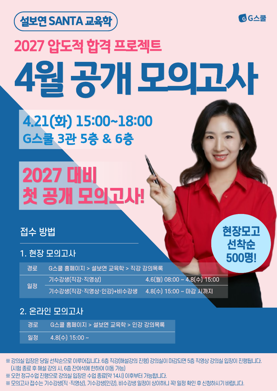 [G스쿨] ★설보연 교육학★ 2027대비 4월 공개 모의고사(4.21 화요일) ★현장모의고사 선착순 500명!★ 작성자G스쿨|작성시간16:00|조회수14 목록 댓글 0 글자크기 작게가 글자크기 크게가 ★접수 일정★1. 학원 현장 모의고사 -기수강생(직강·직영상) : 4.6(월) 08시 ~ 4.8(수) 15시-기수강생(직강·직영상·인강)+비수강생 : 4.8(수) 15시 ~ 선착순 마감 시까지 2. 온라인 모의고사 : 기/비수강생 모두 4.8(수) 15시 ~ 다음검색 현재 게시글 추가 기능 열기 북마크 공유하기 신고 센터로 신고 댓글 댓글 0 댓글쓰기 답글쓰기 댓글 리스트