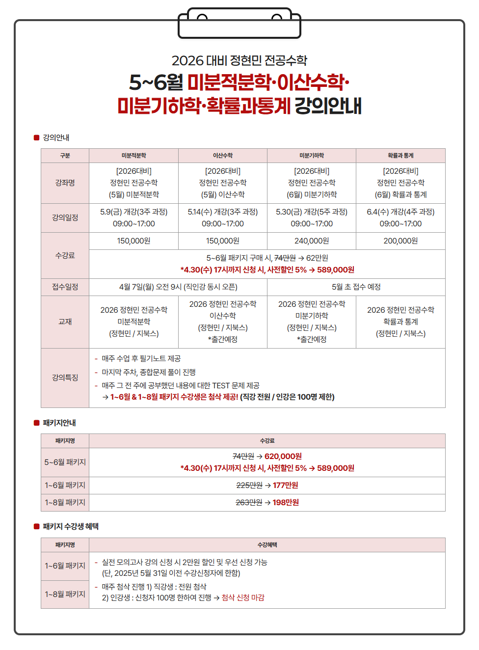 [G스쿨] 정현민 전공수학 5~6월 강의 안내 ★5~6월 패키지 사전할인 5%★ 작성자G스쿨|작성시간25.04.04|조회수105 목록 댓글 0 글자크기 작게가 글자크기 크게가 ★직·인강 접수 4월 7일 월요일 오전 9시 동시 오픈★ ★5~6월 패키지 5% 사전할인!★: ~4월 30일(수) 17시까지 진행되며 이후 수강료 변경 다음검색 현재 게시글 추가 기능 열기 북마크 공유하기 신고 센터로 신고 댓글 댓글 0 댓글쓰기 답글쓰기 댓글 리스트