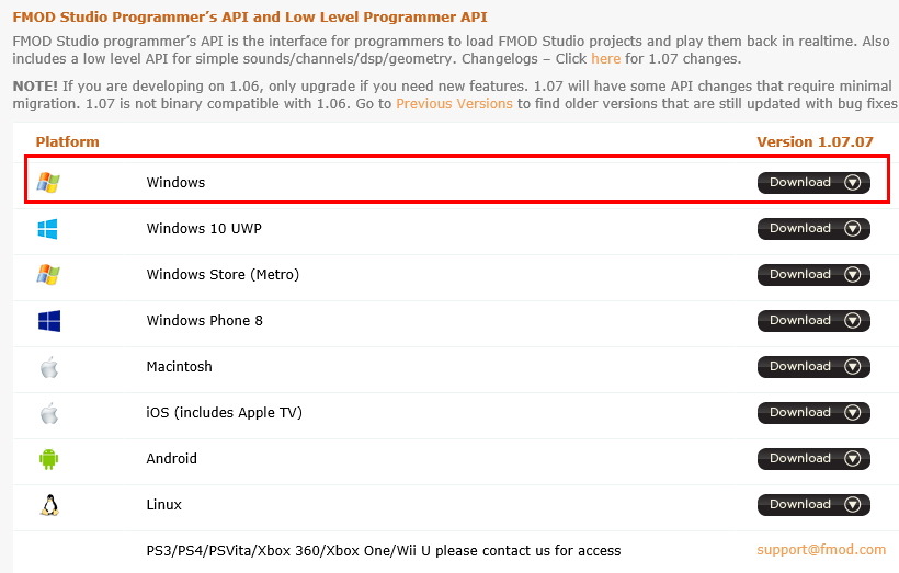 www.FMOD.rog 에서 다운받을 때는 다음 항목에서 다운 받으시면 되지만 로그인을 하는 불편함이 있어서