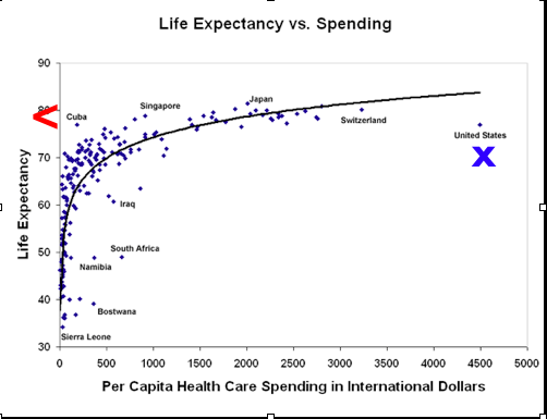 In Cuba, for example, where food, petrol and oil all have been scarce for 50 years as a consequence of economic blockades, citizens "achieve the same level of health for only 5% of the health care expenditure of Americans," according to Science magazine.