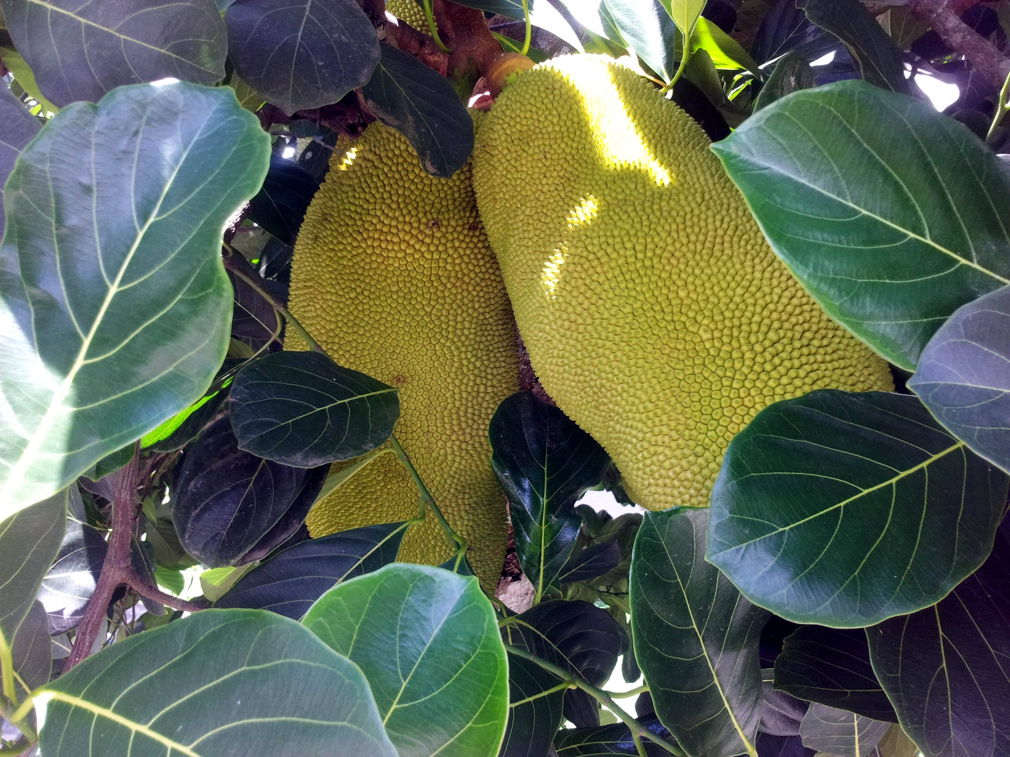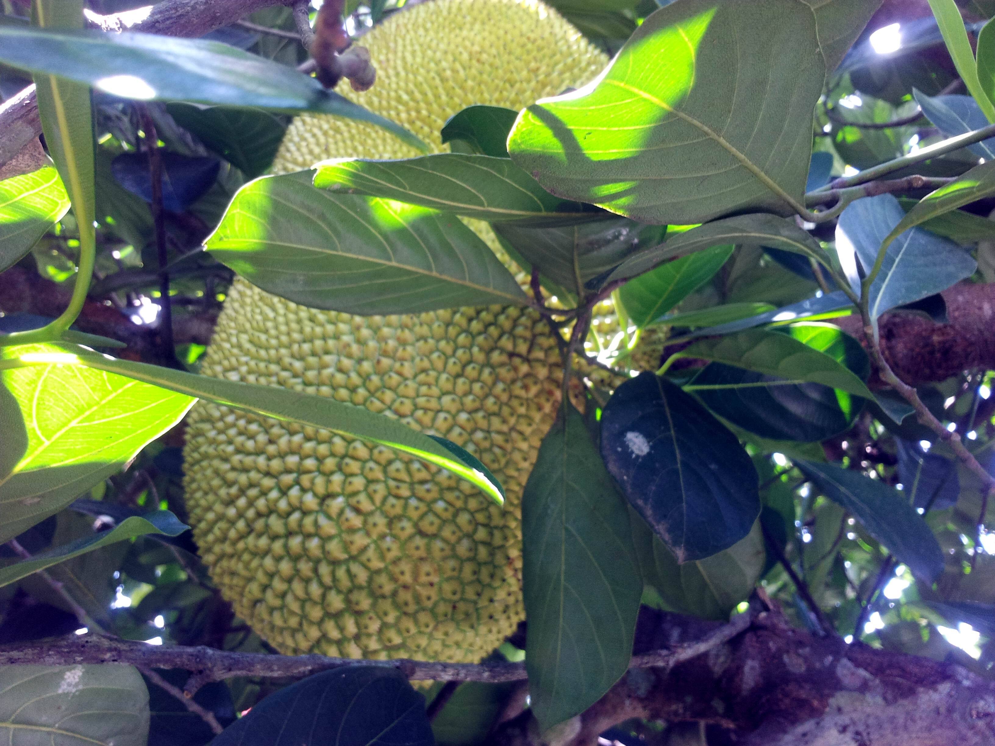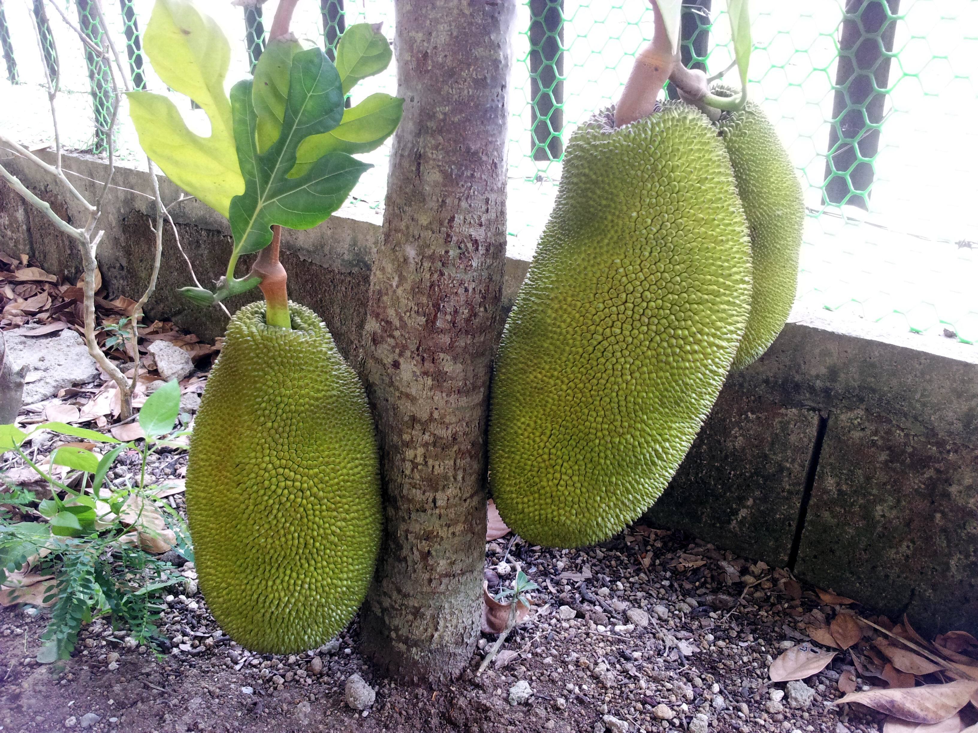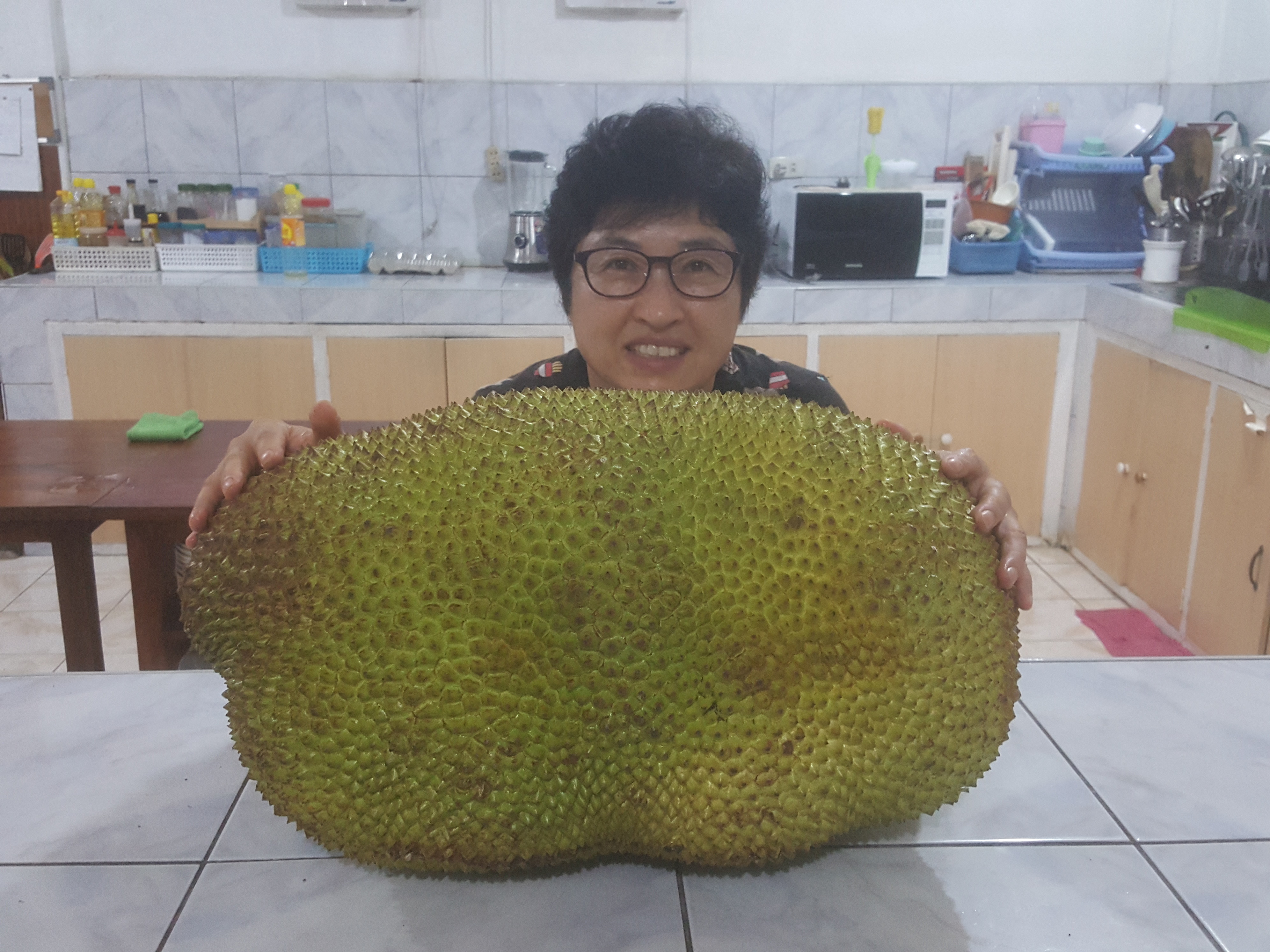 언젠가 맛있는 잭프릇을 먹고나서 그 씨를 펜스 근처에 심어놓았더니 어느 순간 싹이 돋고 웬만큼 자란 것을 집안 곳곳에 옮겨 심어놓았는데 심은 지 3년 후부터 열매를 맺기 시작하더니 이제는 나무마다 주렁주렁 달립니다. 어떤 나무에는 열매가 너무 많이 달려서 일부를 솎아내야만 했습니다. 그 커다란 열매가 주렁주렁 달려있으니 나뭇가지가 얼마나 힘들었겠습니까? 하나의 무게가 보통 25kg짜리 쌀 한가마와 거의 맞먹는데 현재 세계 최고 무게의 기록을 가진 잭프릇은 45kg이라고 합니다. 우리 집에서는 15킬로가 현재까지 최고 기록인데...아직 멀었네요 ㅋㅋ