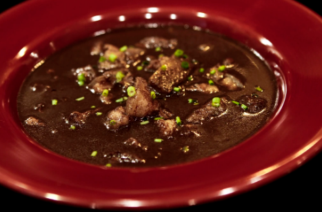 돼지의 피와 식초로 돼지 고기와 내장을 주 재료로 사용하여 요리합니다