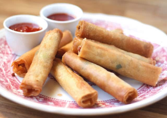 이 튀김 롤은 다진 고기와 야채로 채워지고 달콤하고 신 디핑 소스와 함께 제공됩니다.