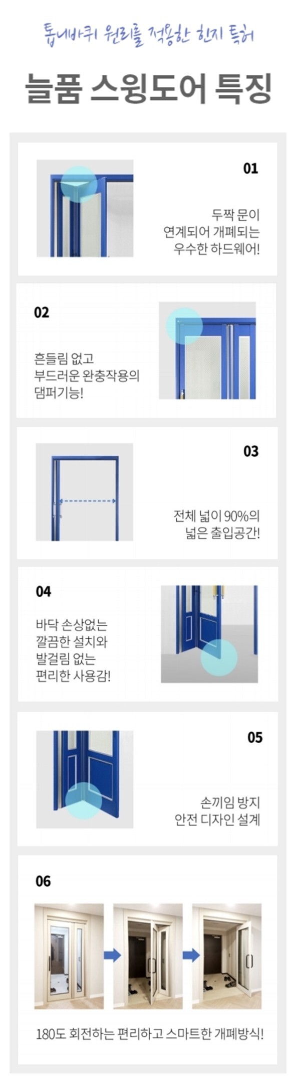 스윙도어는 열었을 때 출입공간이 90%이상이 확보가 되며,문틀이 없어서