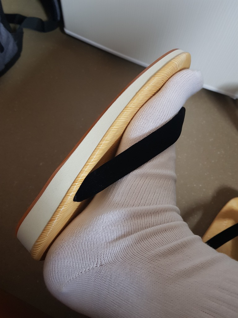 사진은 새 쪼리입니다. 새것이라 끈이 늘어나기전에는 저런식으로 발이 다 안들어가는 크기였습니다.