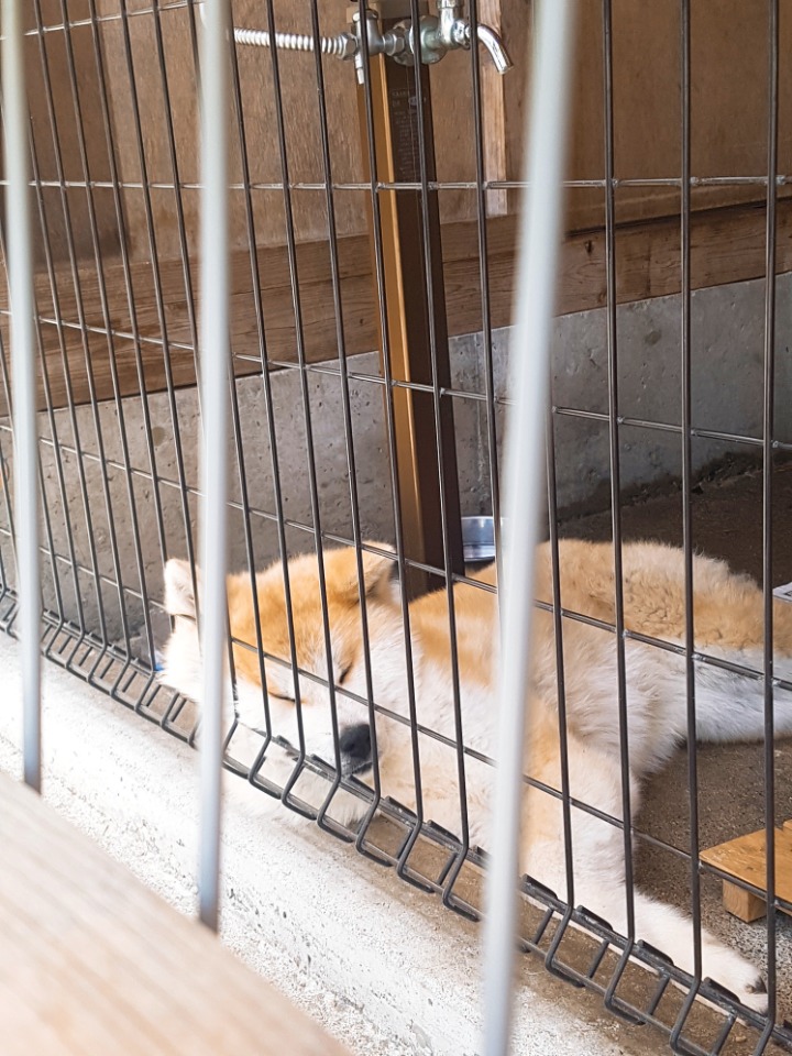 다 먹은 후에는 이 지역에서 유명한 아키타 이누도 봤습니다. 자고 있는 모습이 너무 귀여웠습니다. 옆에 다른 색상의 개도 있었는데 그 개는 너무 커서 늑대 같았습니다..!