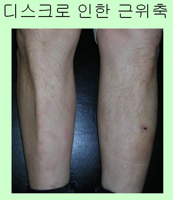 전경골근의 근력이 저하된 환자 10명중 1~2명의 환자에서 육안적으로 확연한 근위축을 관찰할 수 있는데, 요추 5번 신경근이 심하게 압박되면 그림과 같이 전경골근의 위축을 보입니다. 근위축은 시진(inspection)으로 쉽게 판단할 수 있습니다.