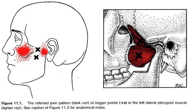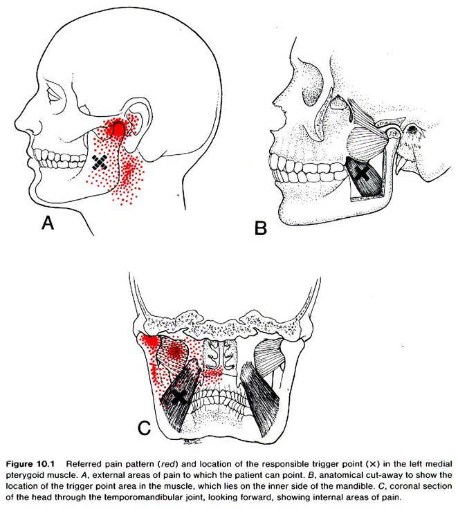 -인후통과 연하 시 통증. TMJ 속과 뒤, 귓속 깊숙이 아리는 느낌이나 멍한 통증(외익상근 보다 좀 더 방사통 부위가 넓다)