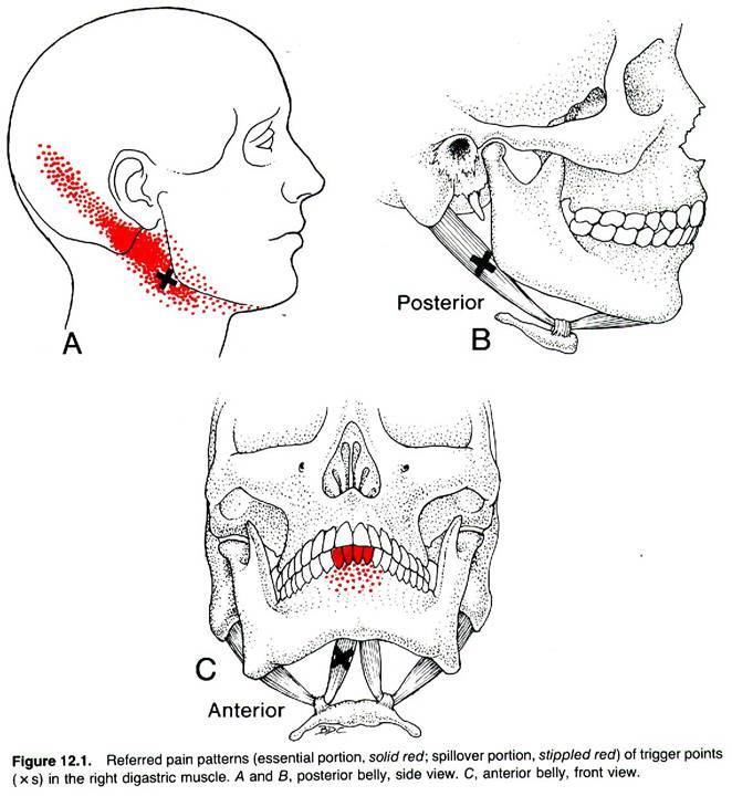 교근 천층⇄내익상근⇄SCM(흉골지 내측), 이복근 후부: 인후통, 후두통, 혀와 입안의 통증.