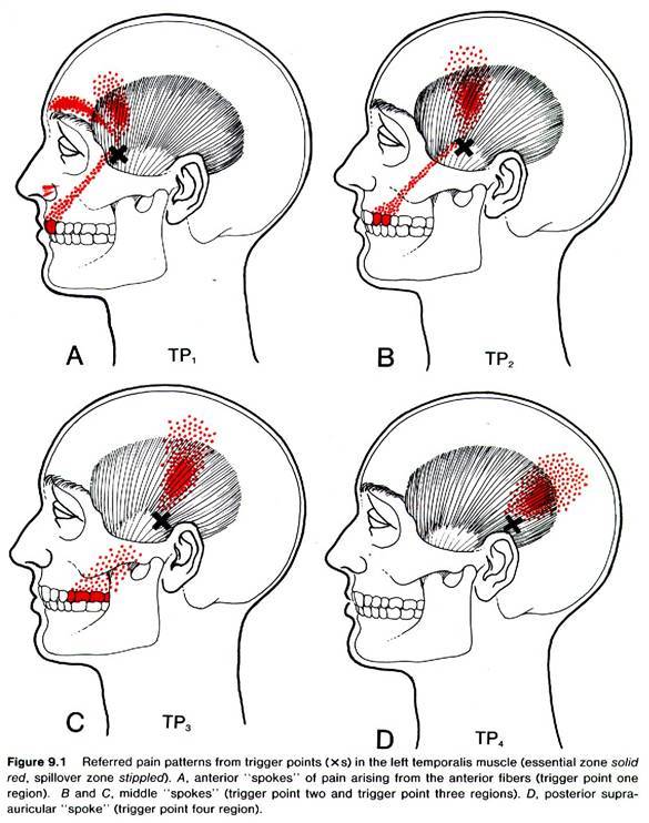 승모근(TP1), SCM(흉골지 중간)⇄교근 천층⇄측두근: 하악각 통증, 상악통, 측두통(태양).