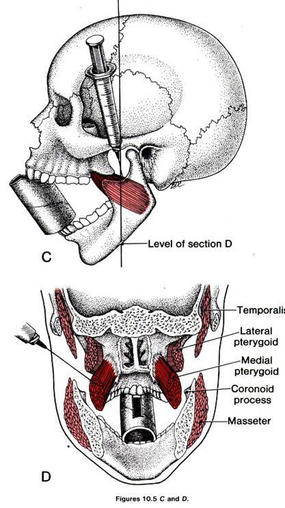 [촉진/자침]입안으로 손을 넣어서 하악각 부위에서 마사지 하거나, 관상돌기와 관절돌기 사이의 공간에서 상부에서 출발하여 아래로 찌른다.