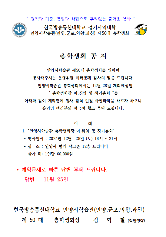 총학생회장 이취임식 작성자진칠곤|작성시간24.11.26|조회수25 목록 댓글 0 글자크기 작게가 글자크기 크게가 다음검색 현재 게시글 추가 기능 열기 북마크 공유하기 신고 센터로 신고 댓글 댓글 0 댓글쓰기 답글쓰기 댓글 리스트