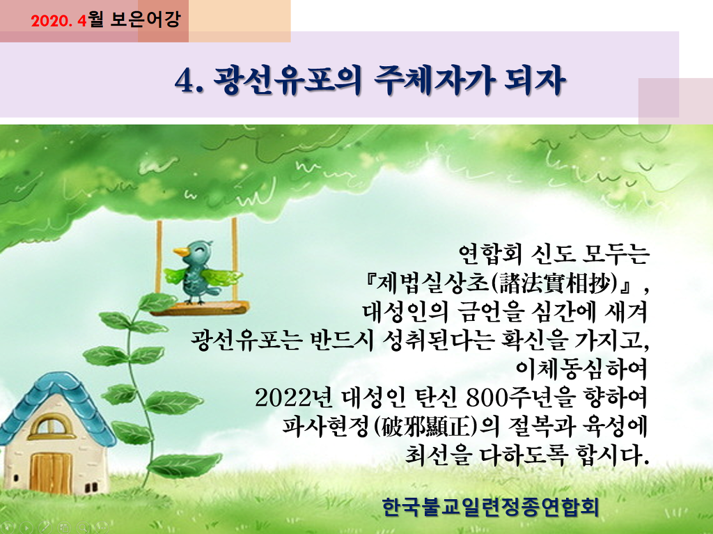 이상 오늘 배운 『제법실상초(諸法實相抄)』, 대성인의 금언을 심간에 새겨 광선유포는 반드시 성취된다는 확신을 가지고, 이체동심하여 2022년 대성인 탄신 800주년을 향하여 파사현정(破邪顯正)의 절복과 육성에 최선을 다하도록 합시다.