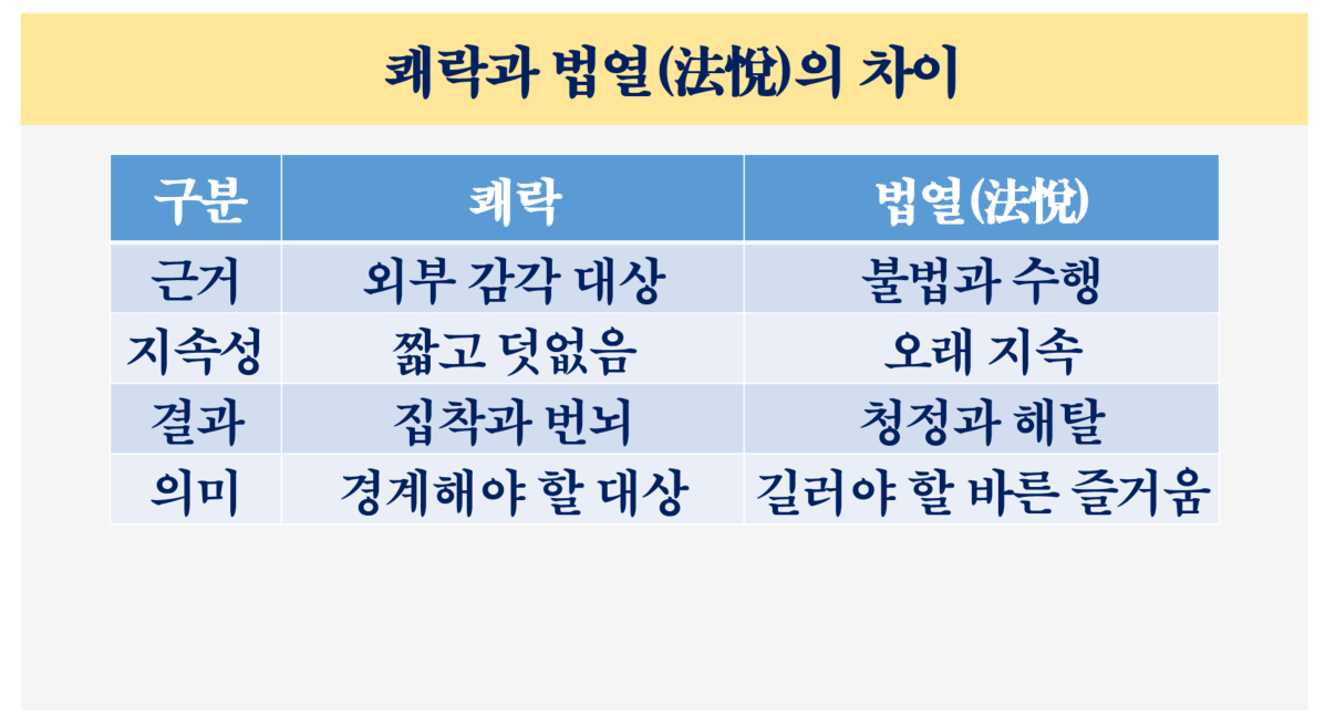 오늘은 9월 보은어강에 도움이 될 것 같아 우리가 살아가면서 누구나 경험하는 두 가지 즐거움, 쾌락과 법열(法悅)에 대하여 말씀드리겠습니다.