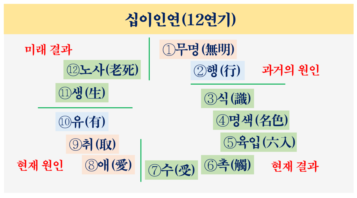 이렇게 과거의 원인이 현재의 결과를 낳고, 현재의 원인이 다시 미래의 결과를 만들어 삼세(三世)를 통틀어 괴로움이 이어지는 구조를 ‘십이인연’이라 합니다.