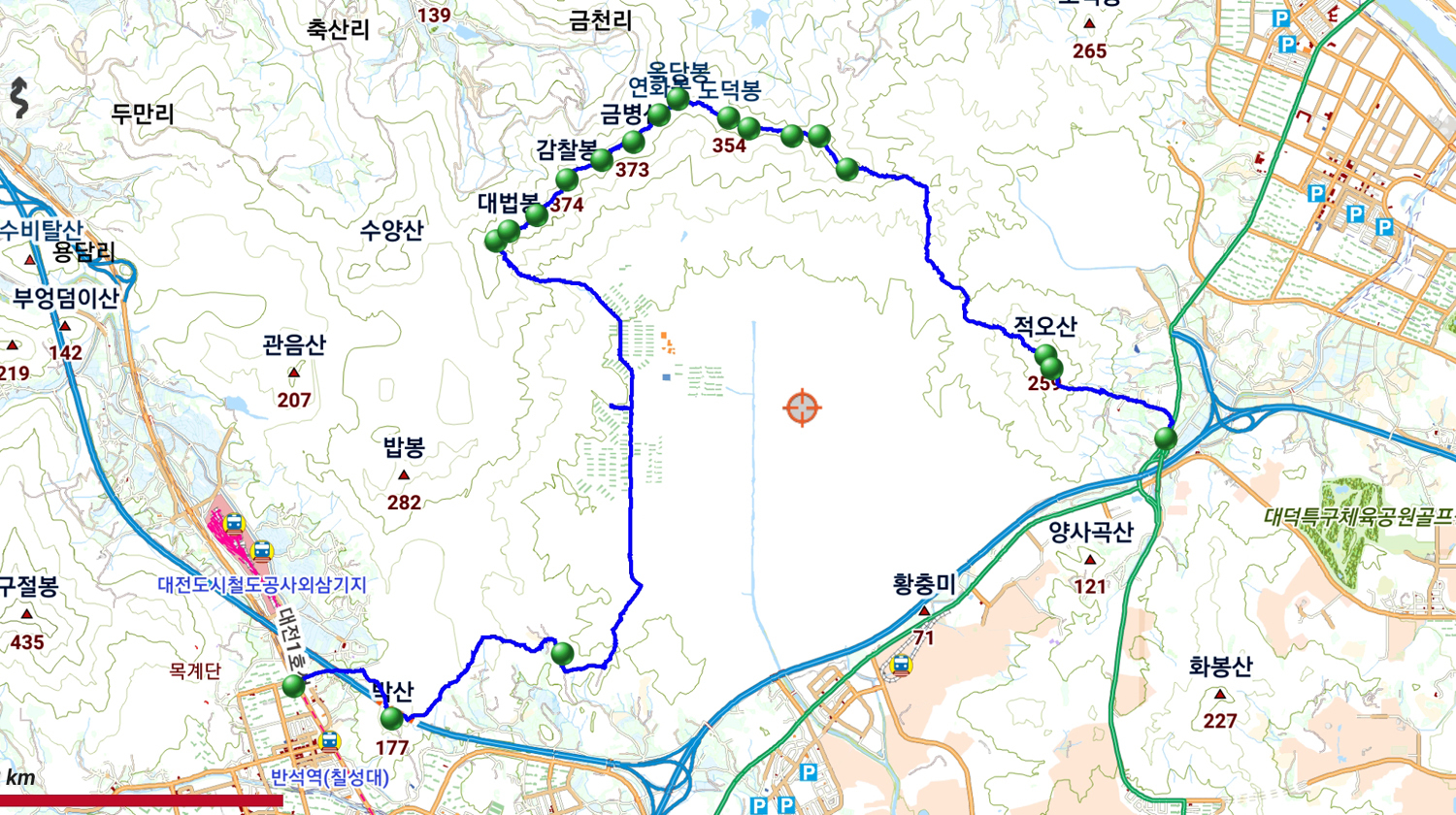 01. 박산(177m) △(대전440)(126m) 금병산(창덕봉(365m) 대법봉(353m) 한덕봉(356m) 감찰봉(374m) 출세봉(355m) 운수봉(373m) 연화봉(386m) 옥당봉(377m) 도덕봉(354m) 공덕봉(308m) 일광봉(343m) 옥련봉(324m)) △(대전410)(347m) 적오산(259m) △(대전436)(257m) : 대전광역시 유성구 방현동