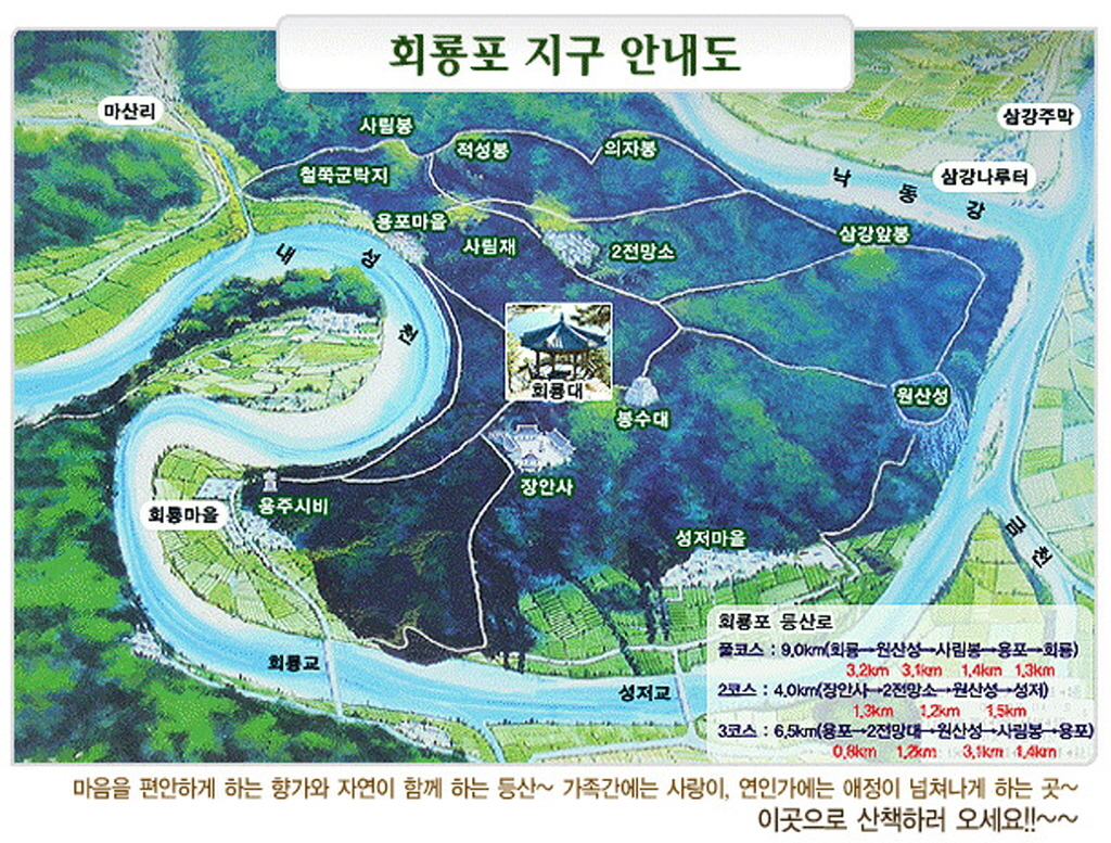 회룡포는 태백산의 끝줄기가 만나 태극모양으로 휘감겨 있으며 마을은 소백산 줄기의 끄트머리입니다.
