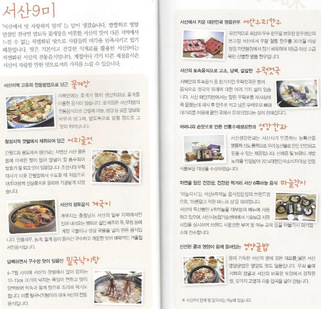 9미:꽃게장/서산어리굴젓/게국지/밀국낙지탕/서산우리한우/우럭젓국/생강한과/마늘각시/영양국밥/