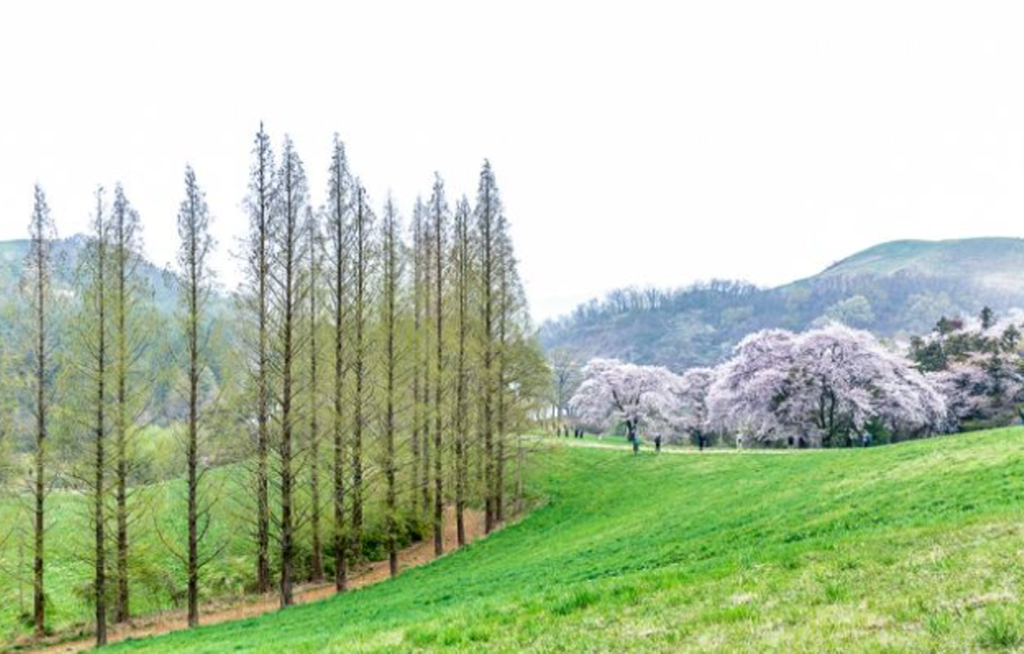 ❍ 초지 능선을 따라 벚나무가 늘어선 풍경은 누구나 카메라를 들어 담고 싶게 만들 만큼 목장의 아름다움을 극대화한다.