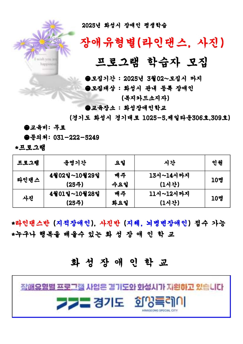 장애유형별 (라인댄스, 사진) 프로그램 학습자 모집 작성자화성장애인야학|작성시간25.05.19|조회수44 목록 댓글 0 글자크기 작게가 글자크기 크게가 학교형태의 장애인평생교육시설 화성장애인학교에서 장애유형별 (라인댄스, 사진) 프로그램 학습자를 모집합니다.장애유형별 프로그램 사업은 경기도와 화성시가 지원하고 있습니다. 다음검색 현재 게시글 추가 기능 열기 북마크 공유하기 신고 센터로 신고 댓글 댓글 0 댓글쓰기 답글쓰기 댓글 리스트